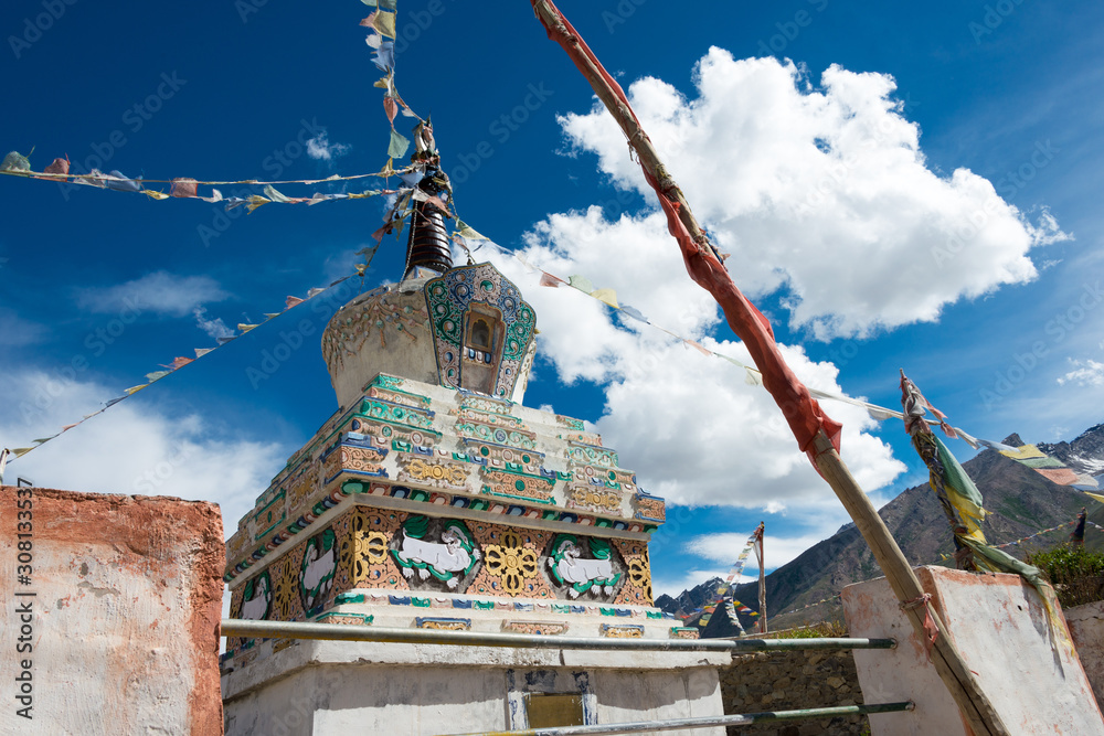 Zanskar, India - Aug 15 2019 - Stupa at Padum Village in Zanskar, Ladakh, Jammu and Kashmir, India.