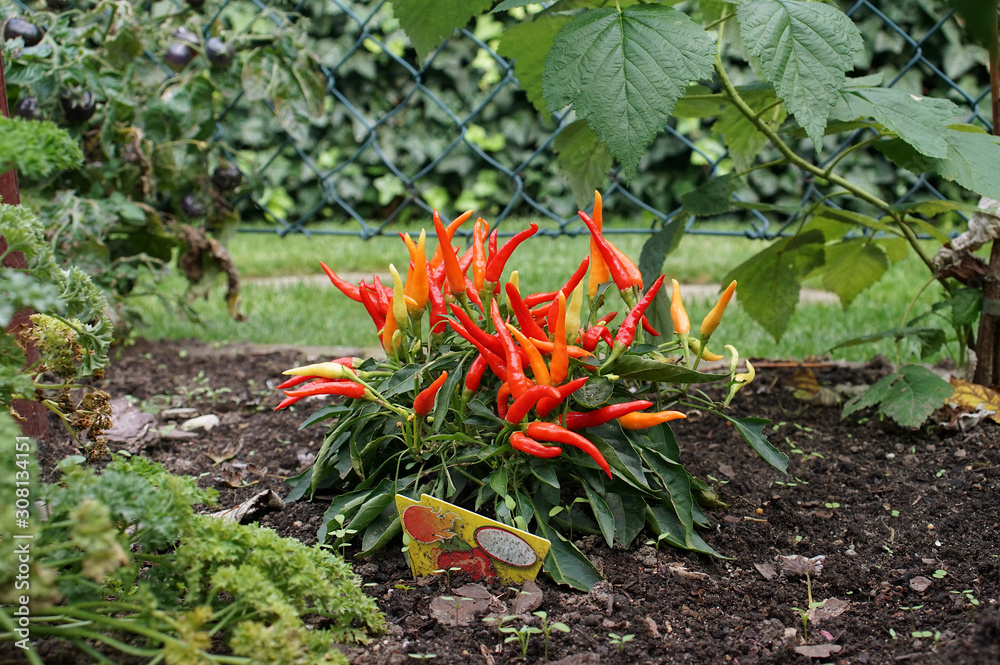a small bush of chili peppers in the backyard garden