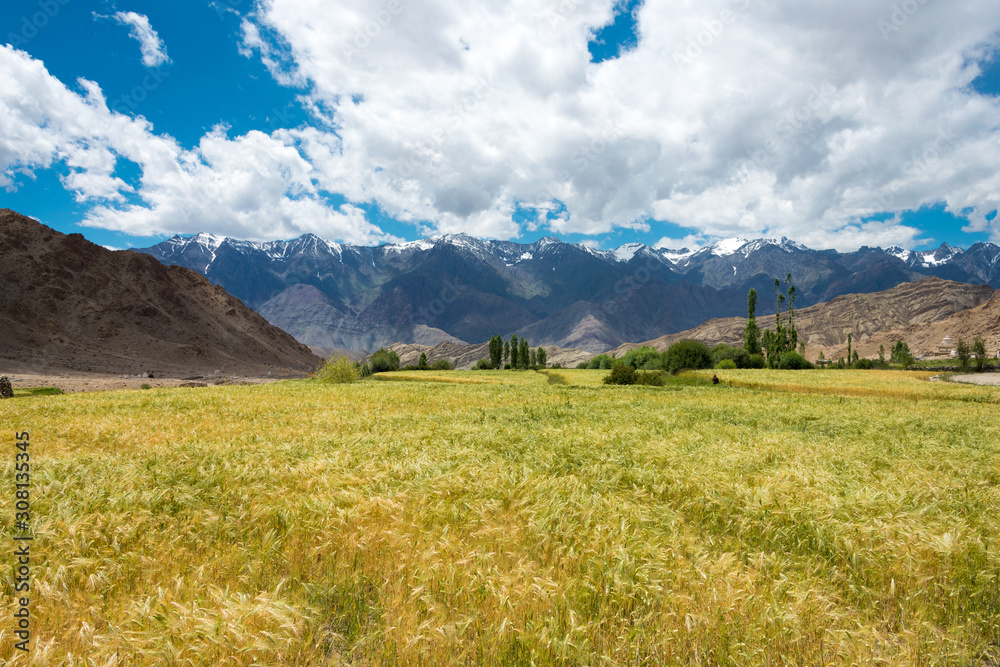 Ladakh, India - Aug 20 2019 - Wheat field at Likir Village in Ladakh, Jammu and Kashmir, India.