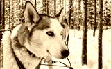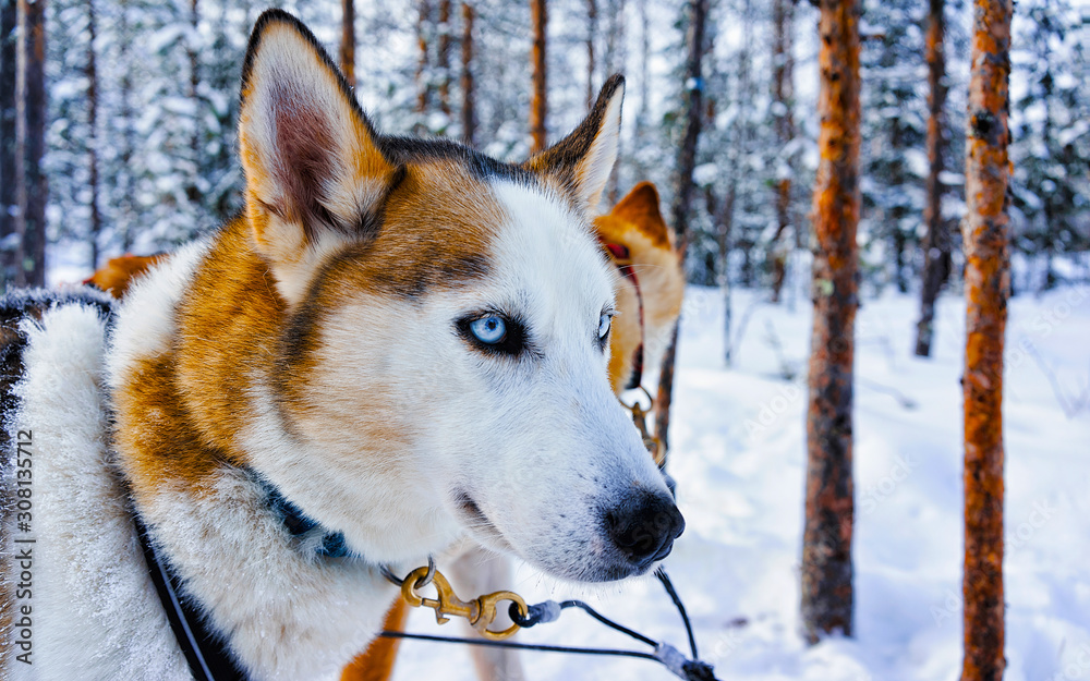 Husky family dog sled in winter Rovaniemi of Finland of Lapland. Dogsled ride in Norway. Animal Sledding on Finnish farm after Christmas. Fun on sleigh. Safari on sledge and Alaska landscape.