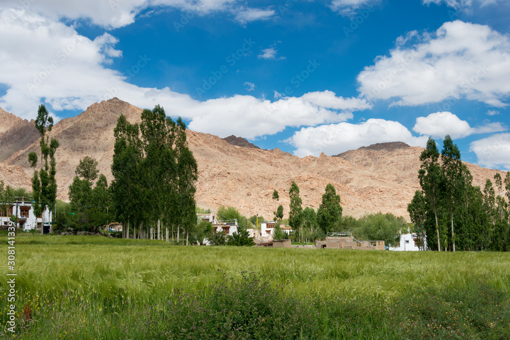 Ladakh, India - Aug 22 2019 - Grassland at Hemis Shukpachan Village in Sham Valley, Ladakh, Jammu and Kashmir, India.