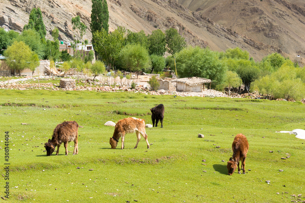 Ladakh, India - Aug 22 2019 - Grassland at Hemis Shukpachan Village in Sham Valley, Ladakh, Jammu and Kashmir, India.