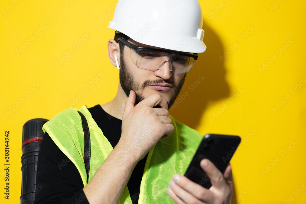 Portrait of young thoughtful man architect with tube of projects, wearing white hard hat and glasses for builders. Using smartphone and wireless earphones on yellow background.