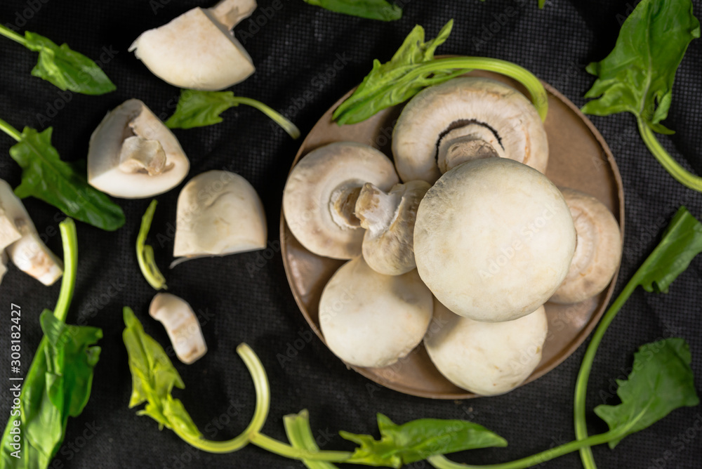 Fresh mushrooms with vegetables on a black background