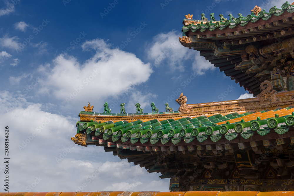 Blue sky and white clouds under the imperial palace ancient buildings cornices close-up