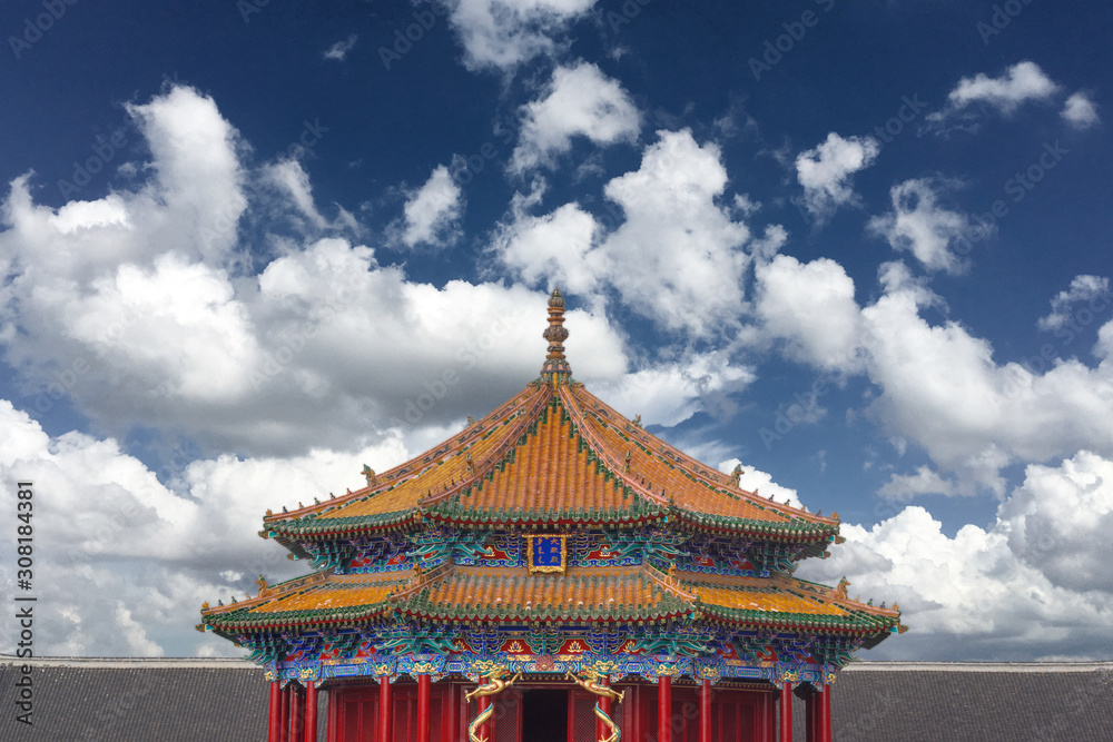 Under the blue sky and white clouds, the ancient buildings of the imperial palace