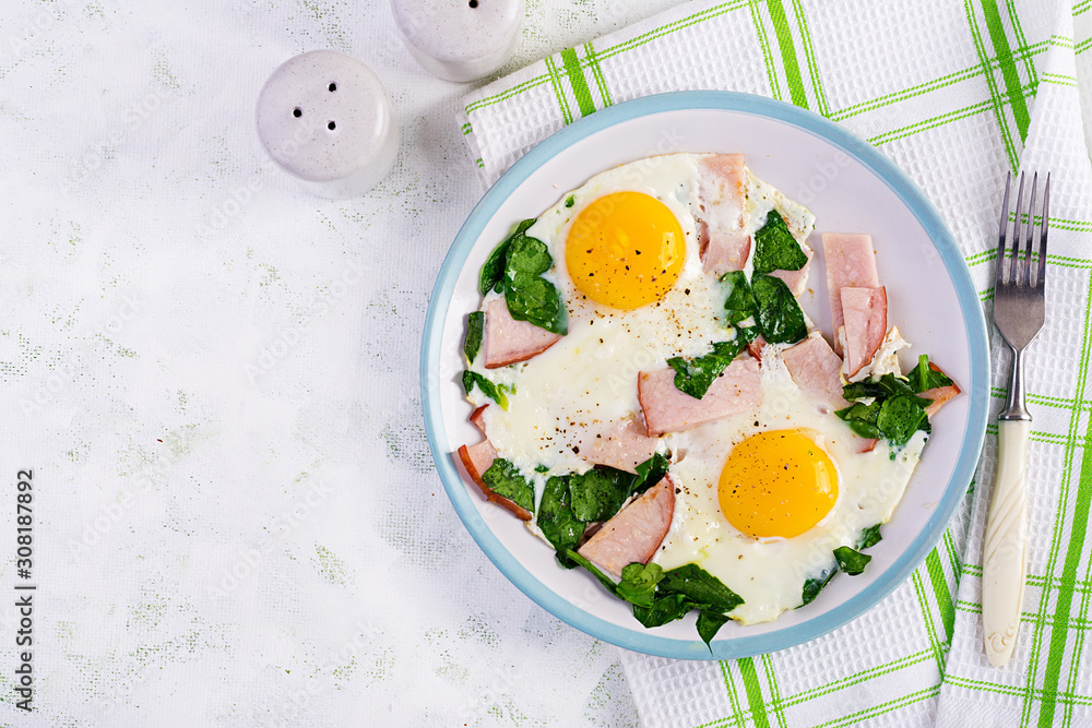 Fried eggs with ham and spinach. Delicious English Breakfast. Brunch. Keto/paleo diet. Top view, overhead