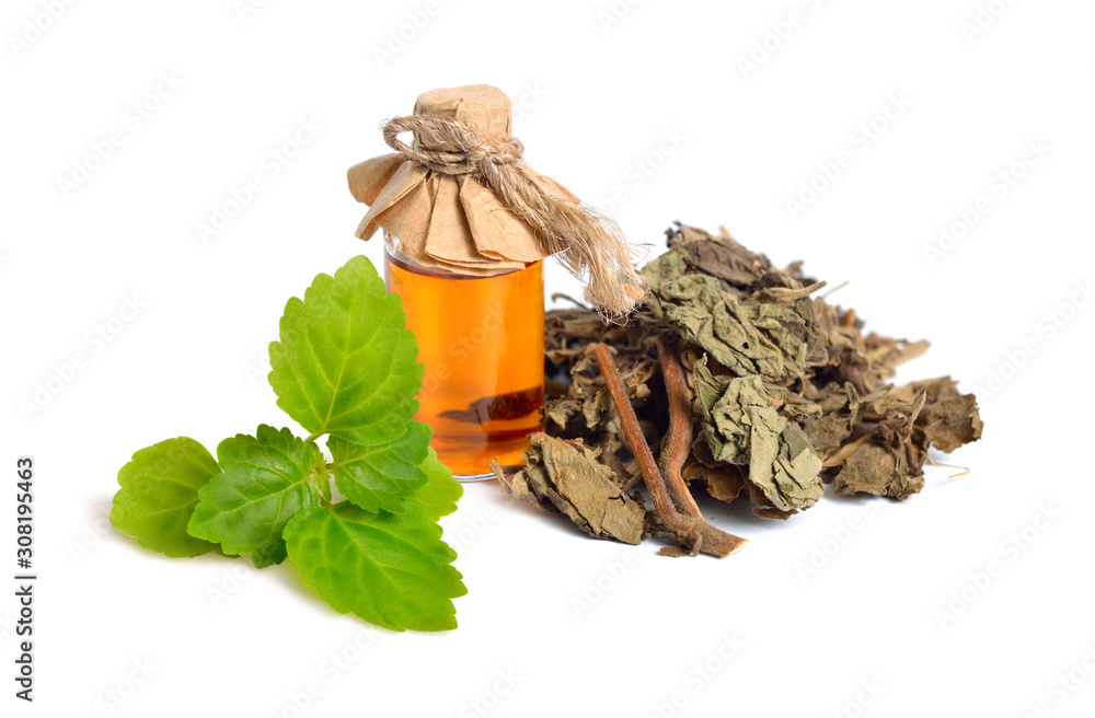 Green Sprout with Dried Pachouli plant. Isolated on white background