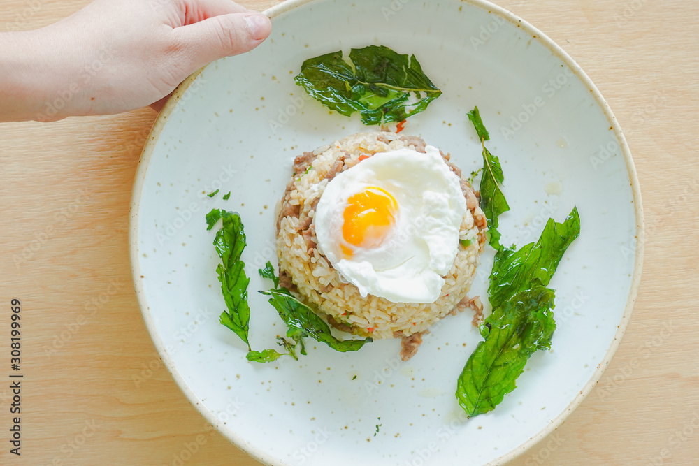 Fried rice with beef, holy basil and thai herb served with poached egg