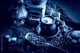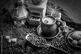 Coffee in a cup and saucer on an old background.
