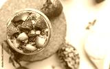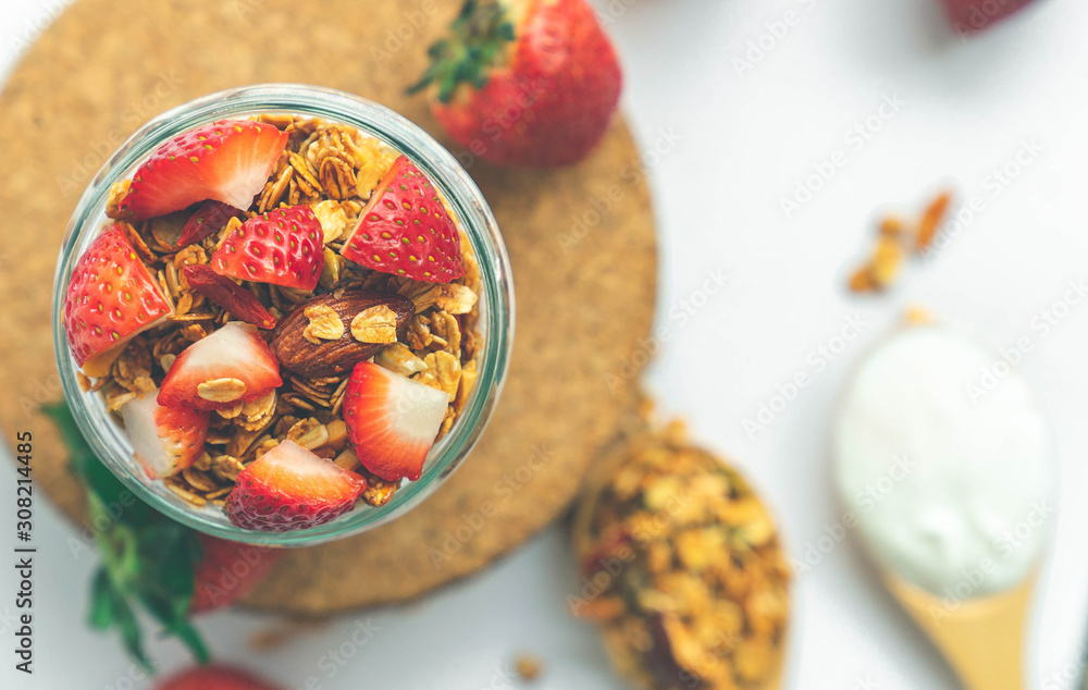 top view healthy granola parfait with fresh strawberry in glass bottle jar, copy space, directly above