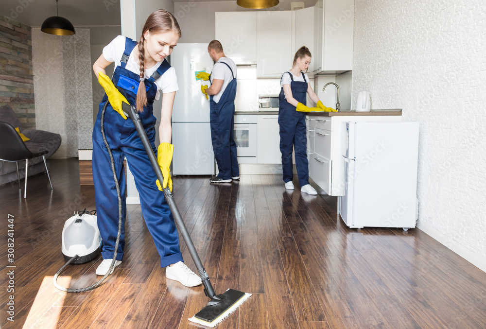Cleaning service with professional equipment during work. professional kitchenette cleaning, sofa dry cleaning, window and floor washing. man and women in uniform, overalls and rubber gloves