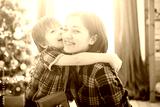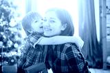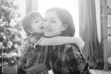 Happy family mom and son on a Christmas winter sunny morning in a decorated Christmas celebration room with a Xmas tree and gifts.