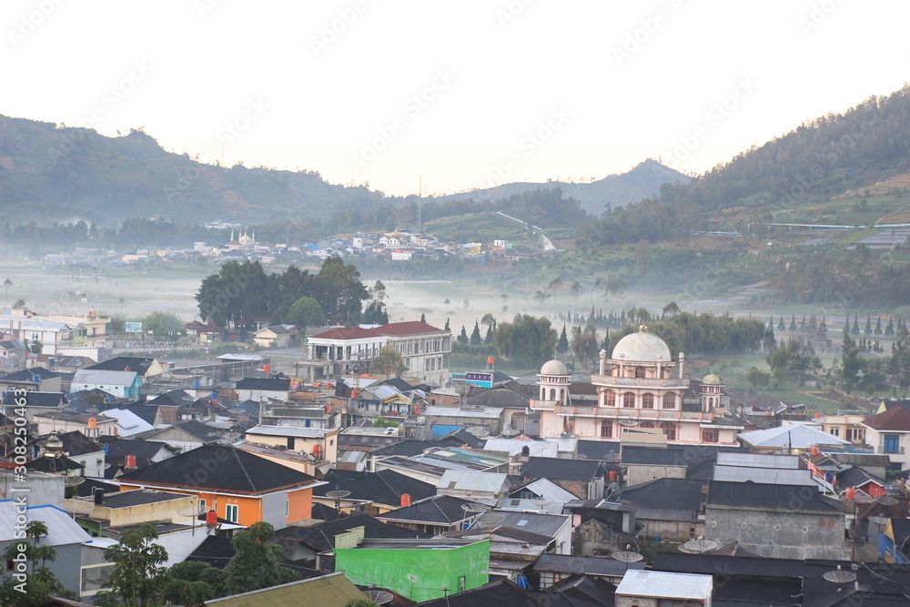 the beauty of the dieng plateau in the morning and the mist enveloping it