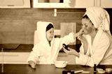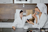 beautiful young mother in bathrobe and her little daughter together with towels on head and mask on face while enjoying spa procedures isolated in kitchen