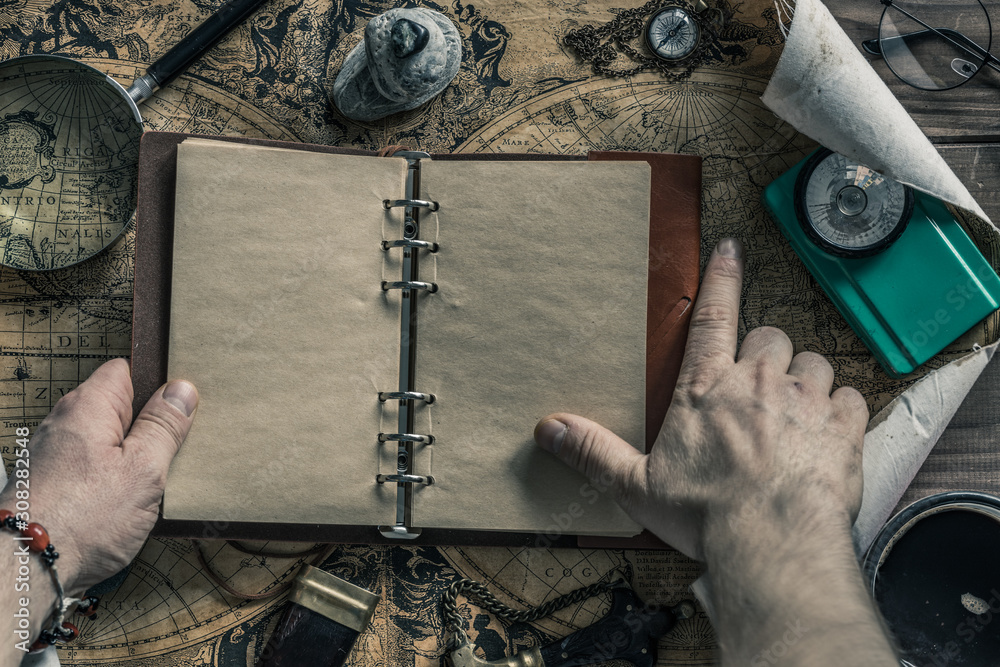Travel planning around the world trip. A finger roaming the map. An open notebook with space for text. Things useful in the expedition. Retro styl