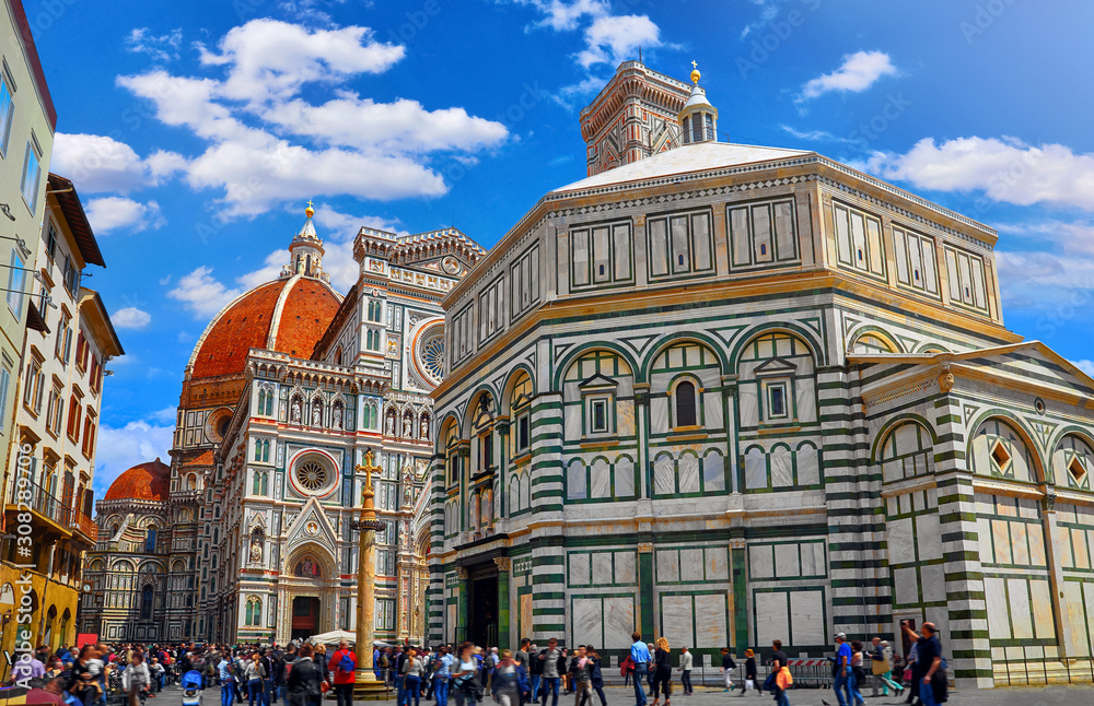 Duomo. Santa Maria del Fiore Cathedral in Florence. Italy. Front side on blue sky background. Sunny day.