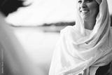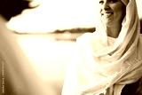Shallow focus shot of a female wearing a biblical robe while talking to Jesus Christ