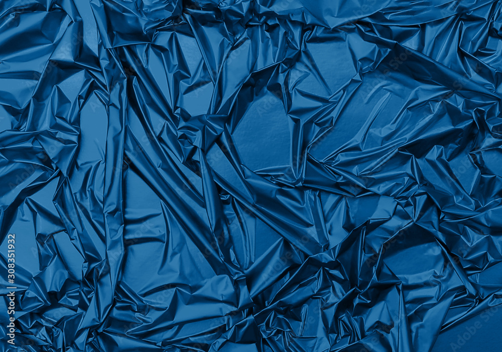 Shiny crumpled surface of trendy blue foil for textured holiday background. Color of the year 2020 concept. Backdrop for your design.
