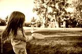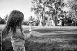 Making memories, breaking the distance. Little girl playing frisbee with her family in the park on a sunny day