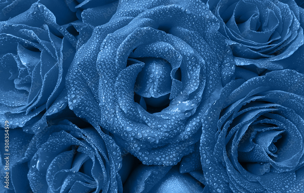 Floral background of beautiful roses buds with water droplets on the petals in trendy blue color. Color of the year 2020 concept. Top view.