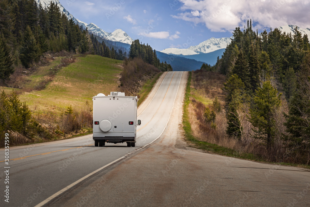 Tourists driving down the roads of the Canadian Rockies in an RV on a beautiful summer day