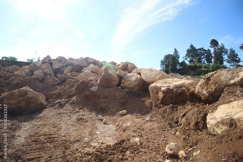 stone quarries with lots of large boulders under the blue sky