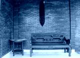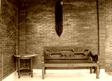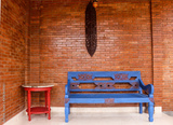 Old traditional chair with brick walls in the back
