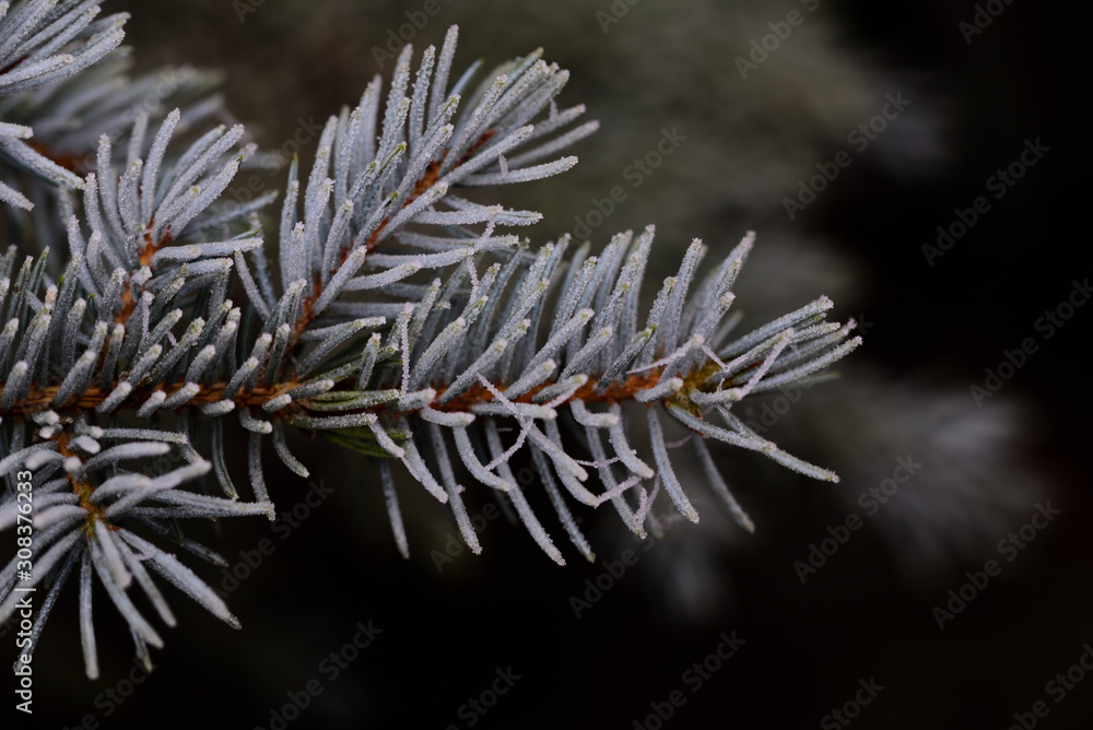 Frozen branch of a conifer in close-up in front of dark background in winter