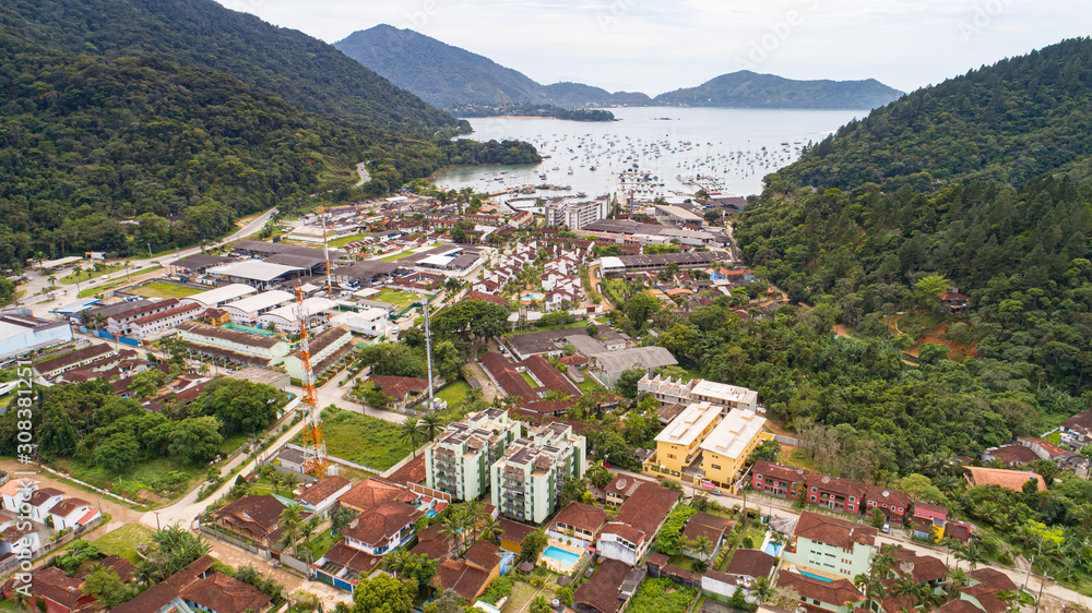 Aerial view of town and Praia do Lázaro (Lazaro beach) and bay, Ubatuba, Brazil