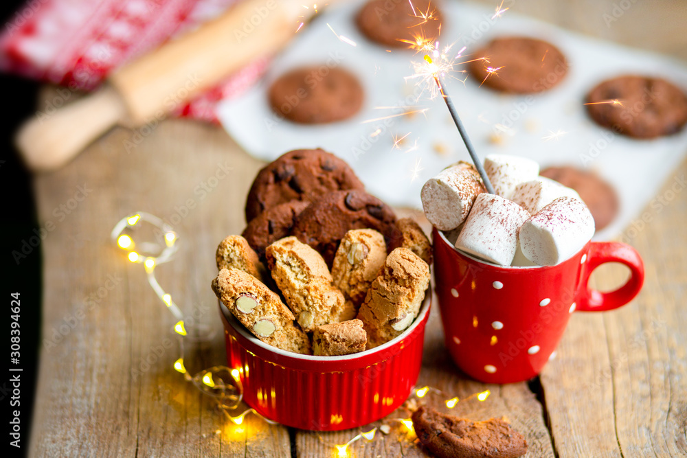 Christmas cookies on a wooden table with cocoa and marshmallows. Christmas candy with a toy on the Christmas tree. Hot Christmas drink with chocolate chip cookies. Sparkler in a cup. Christmas 2020