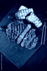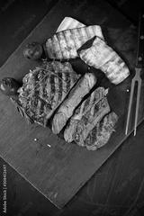 Juicy medium rare beef steak on ceramic board with herbs spices and salt