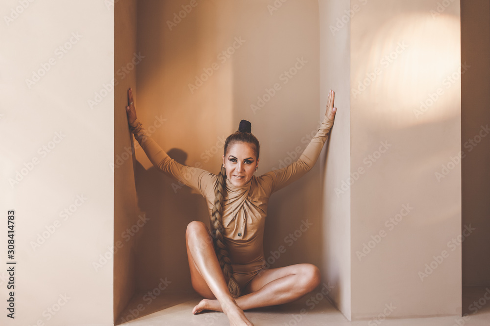 Elegant woman dancer in sexy lingerie posing in the studio. Lady does strip plastic. Flexible girl demonstrates her body in various poses