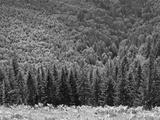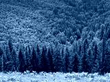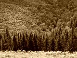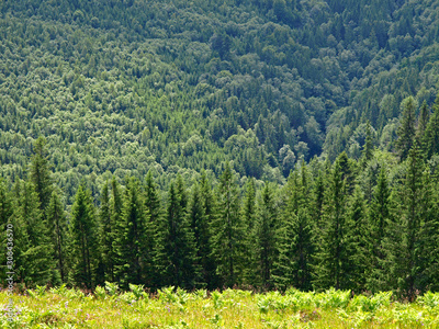 Spruce forest high in green mountains. Picturesque summer mountain landscape with Spruce (Picea abies) forest in the Eastern Carpathians, Ukraine. Mountains and gorges of the Carpathian region
