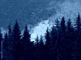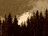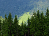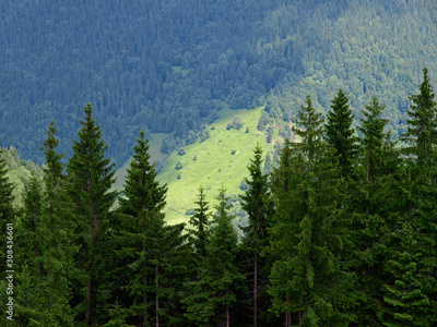 Spruce forest high in green mountains. Picturesque summer mountain landscape with Spruce (Picea abies) forest in the Eastern Carpathians, Ukraine. Mountains and gorges of the Carpathian region