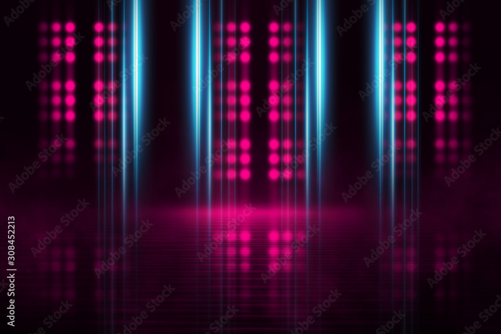 Empty dark abstract background. Background of empty show scene. Glow of neon lights on an empty concert stage.