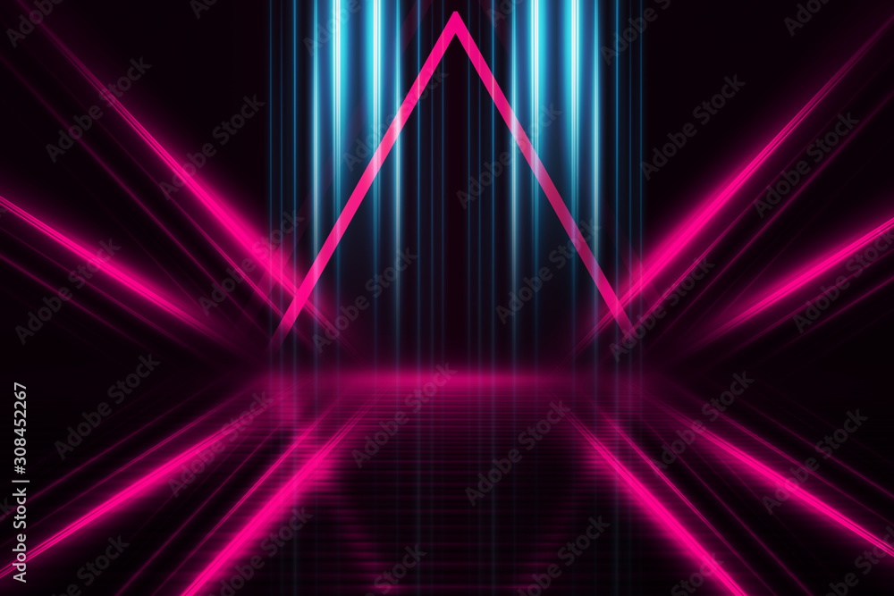 Empty dark abstract background. Background of empty show scene. Glow of neon lights on an empty concert stage.
