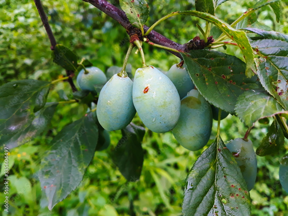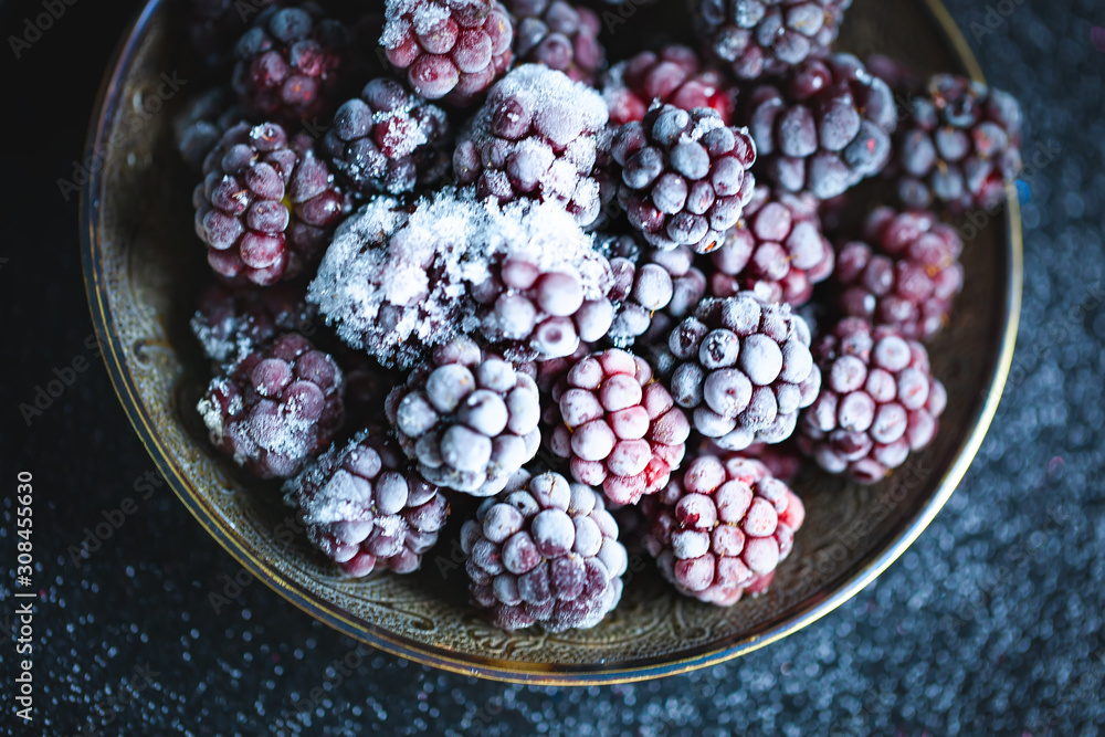Frozen blackberries on a wooden table. Horizontal. Top view.