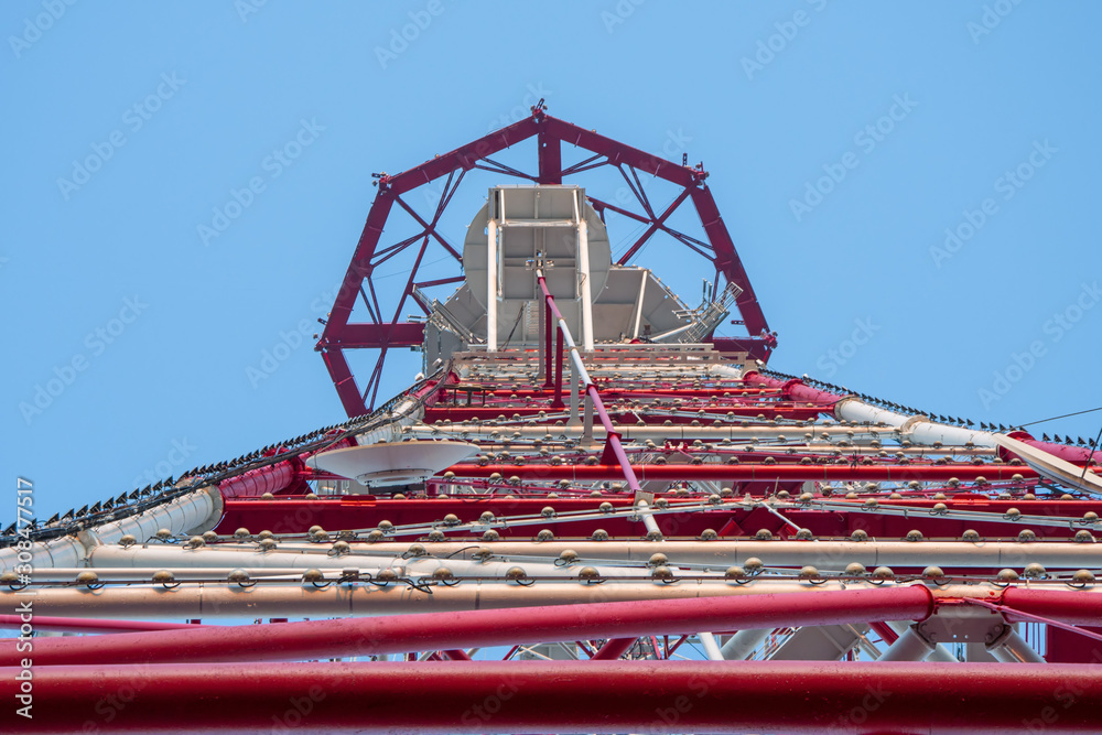 Red pipe connection Assembly, TV tower fasteners, bolts and nuts, threaded connection of the structure.