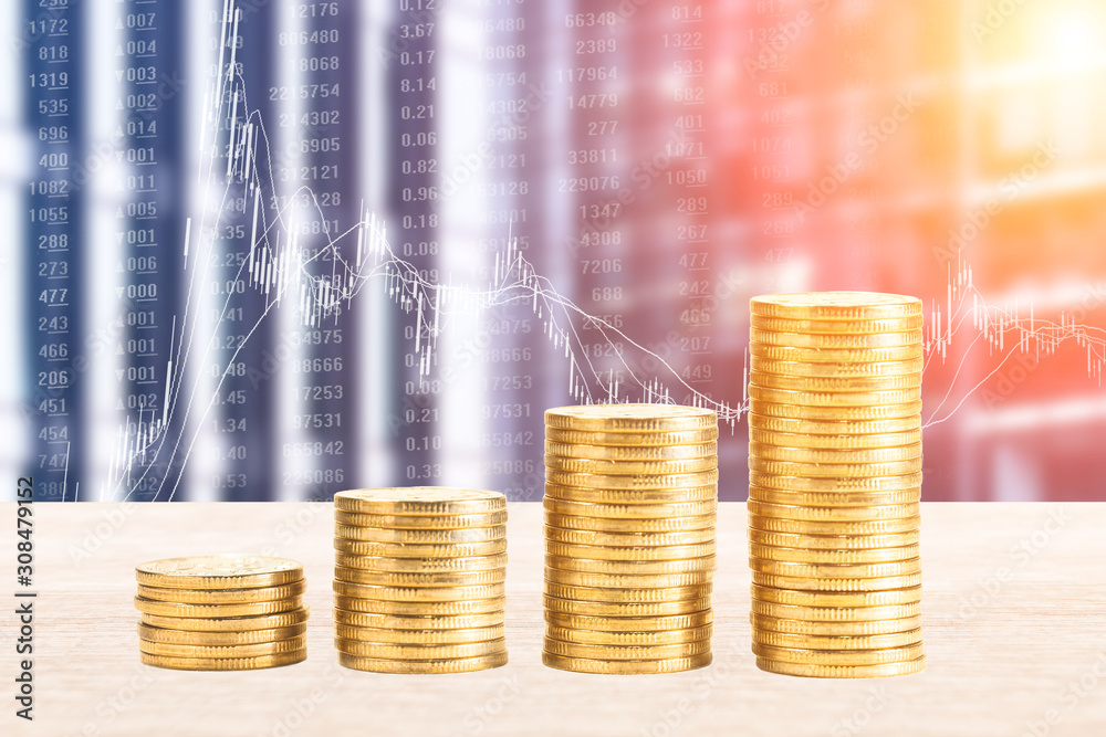 Stock market charts with currency, fuzzy financial center buildings in the background