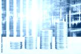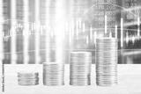 Stock market charts with currency, fuzzy financial center buildings in the background