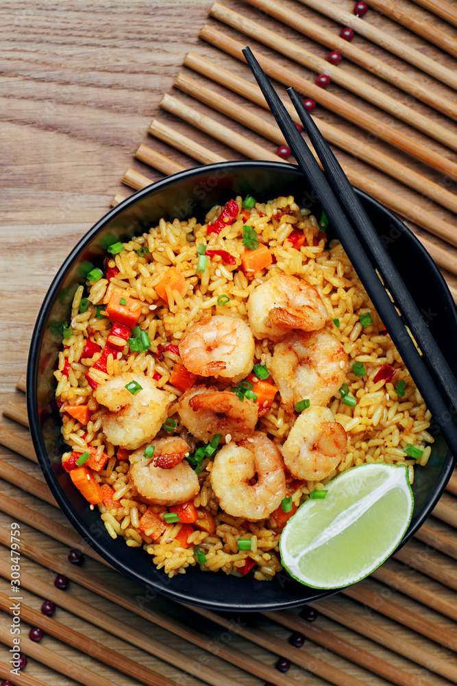 Shrimp fried rice with vegetables, green onions and lime in a black pottery bowl on a bamboo placemat. Traditional Thai meal with sesame on a table. Top view, directly above shot with space for text.