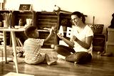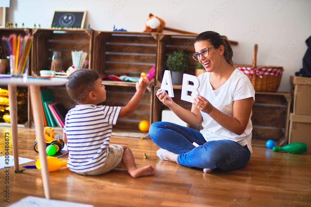 Beautiful teacher teaching alphabet to student toddler boy at kindergarten