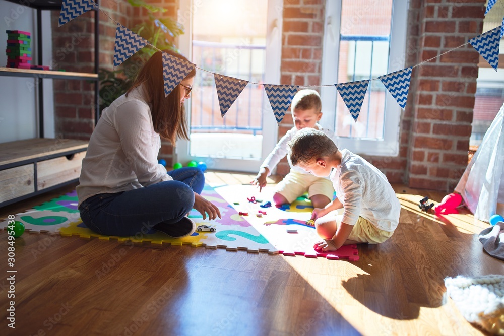 Beautiful teacher and toddlers learning maths using numbers game around lots of toys at kindergarten