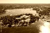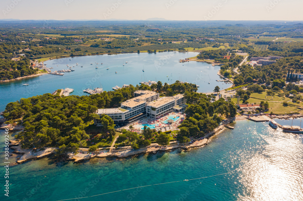 Small Peninsula with hotel, swimming pool and vacationers. The view from the top.