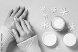 Woman using winter cream for hands.