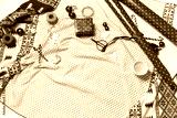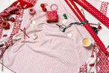 Christmas mood background with preparing gifts, wrapping, packing tape, rope, paper's rools, coffee and decorations props on wrapping paper on plaid with copy space.