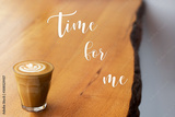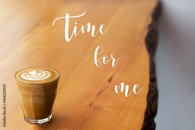 Time for me. Glass with coffee on a wooden table. Cappuccino with almond milk. Vegetarian drink. Relax with a cup of coffee
