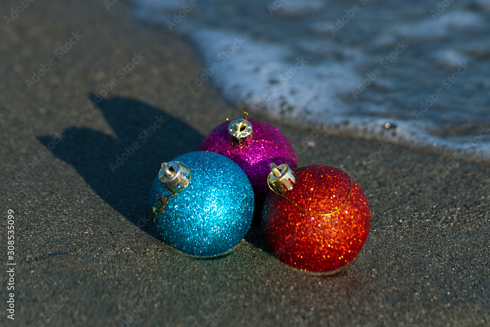Three Christmas balls at the beach