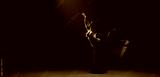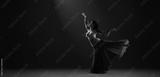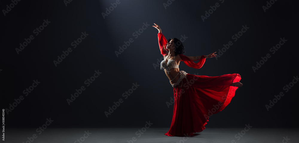 Woman in red arabic dress dancing oriental dances arabesque pose